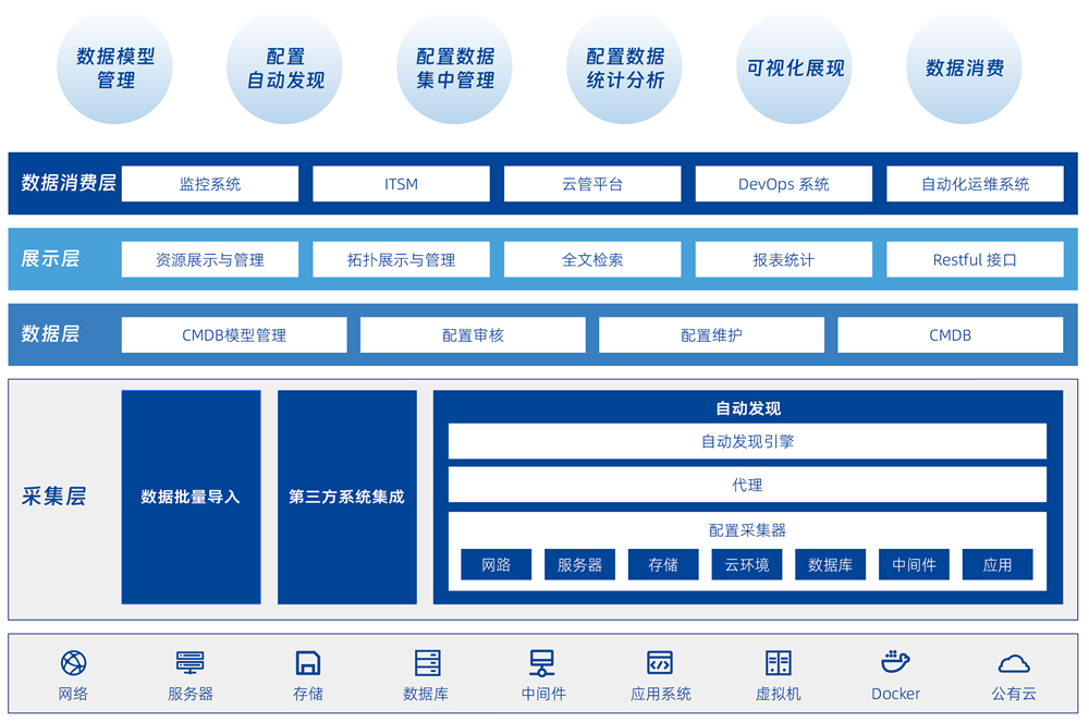 幫助用戶建立統(tǒng)一的運維主數(shù)據(jù),通過各種自動化手段實現(xiàn)以應(yīng)用為核心的全面資源管理以及運維消費場景共享。系統(tǒng)具備靈活的 CMDB 分層建模和配置信息維護機制,可以提供面向業(yè)務(wù)的 IT 架構(gòu)畫像,為各個運維工具提供集中化的資源信息管理和協(xié)同,為 IT 運維和 DevOps 體系下的各種運維場景提供數(shù)據(jù)消費服務(wù)。