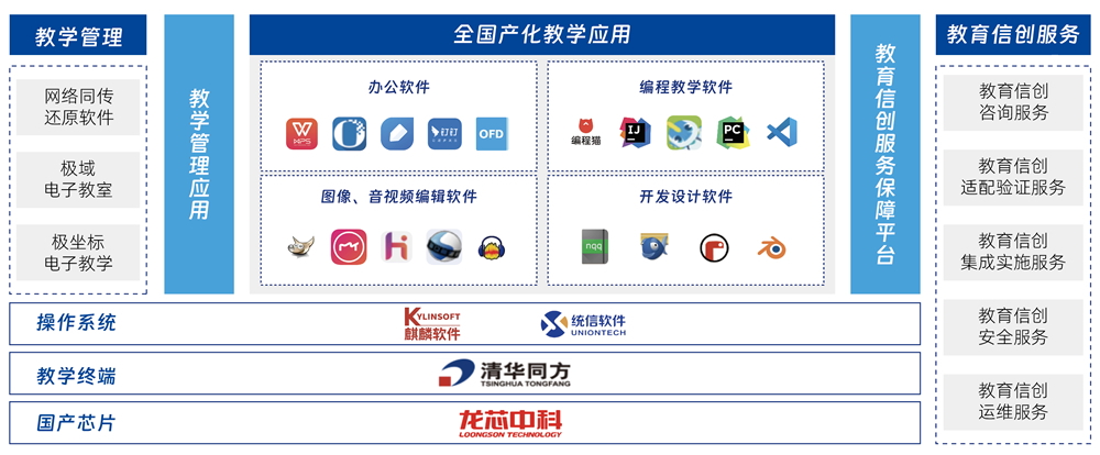 教育信創解決方案,結合信創業務特點和教育信息化行業特色,緊貼K12用戶教育、教學需求。以校園日常管理與實際教學需求為導向,通過信創軟件與硬件作為方案底層架構。從底層芯片、整機硬件到基礎操作系統軟件、教學管理軟件、辦公軟件、編程教學軟件等全部實現國產自主化,滿足中小學信息技術基礎教學空間中的實際使用需求。
