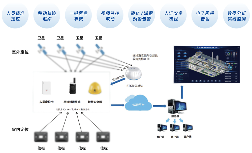 室內室外融合定位技術,確保作業人員、車輛位置可實時監測,及時預警,可有效減少或避免安全事故的發生。