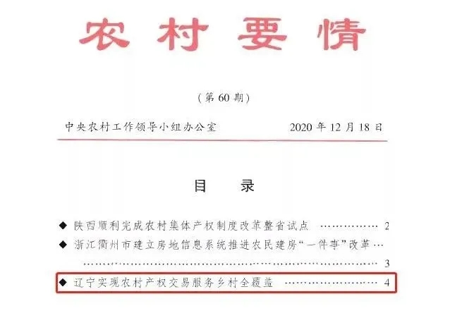 近日,中央農(nóng)村工作領(lǐng)導(dǎo)小組辦公室印發(fā)的《農(nóng)村要情》第60期刊登了《遼寧實現(xiàn)農(nóng)村產(chǎn)權(quán)交易服務(wù)鄉(xiāng)村全覆蓋》,對遼寧省依托沈陽農(nóng)村綜合產(chǎn)權(quán)交易中心,建成“省市縣鄉(xiāng)四級監(jiān)管、省市縣鄉(xiāng)村五級聯(lián)動”的農(nóng)村產(chǎn)權(quán)交易網(wǎng)絡(luò)信息服務(wù)平臺,實現(xiàn)農(nóng)村產(chǎn)權(quán)交易省域全覆蓋及搭建農(nóng)村產(chǎn)權(quán)交易“政府監(jiān)管+市場交易”運營模式取得的交易經(jīng)驗和工作成果給予充分的肯定。
