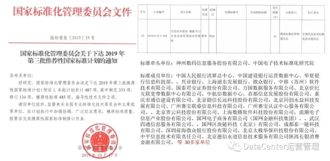 《數據中心業務連續性等級評價準則》于2016年啟動立項準備工作,并于2017年正式上報國家標準提案。2019年《國家標準委關于下達2019年第三批國家標準制修訂計劃的通知》中,國家標準《數據中心業務連續性等級評價準則》獲正式立項,標準計劃號:20193178-T-469
