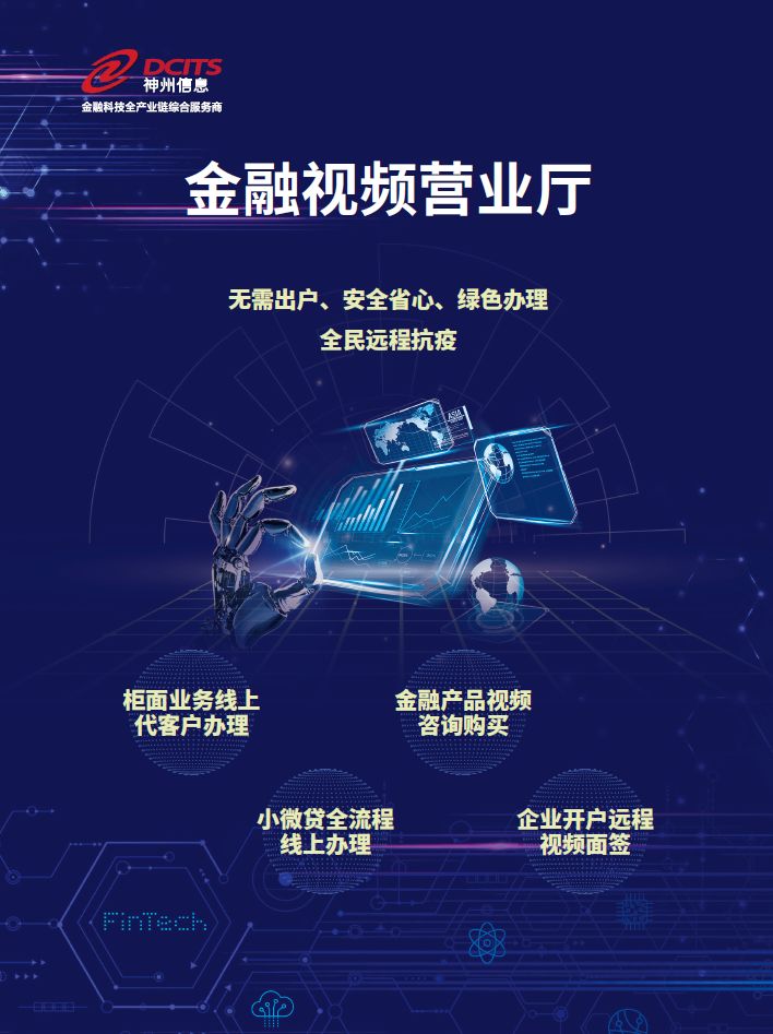 神州信息“金融視頻營(yíng)業(yè)廳”基于5G、音視頻交互、人臉識(shí)別、語(yǔ)音識(shí)別、光學(xué)字符識(shí)別、自然語(yǔ)言理解等多項(xiàng)前沿技術(shù)打造,通過1+1+N模式(1視頻平臺(tái)、1應(yīng)用平臺(tái)、N業(yè)務(wù)場(chǎng)景)滿足客戶對(duì)金融服務(wù)的多樣性需求,如:對(duì)公開戶法人視頻面簽,貸款視頻認(rèn)證面簽,金融產(chǎn)品視頻咨詢及購(gòu)買,視頻代客更新客戶身份證有效期、手機(jī)號(hào)等,以及辦理密碼重置、賬戶激活、大額轉(zhuǎn)賬等業(yè)務(wù)。相較于傳統(tǒng)線上業(yè)務(wù)辦理方式,該方案可有效核驗(yàn)客戶身份,確認(rèn)客戶意愿,有效防范業(yè)務(wù)風(fēng)險(xiǎn),極大擴(kuò)展了銀行及金融機(jī)構(gòu)的線上業(yè)務(wù)辦理范圍和服務(wù)內(nèi)容。