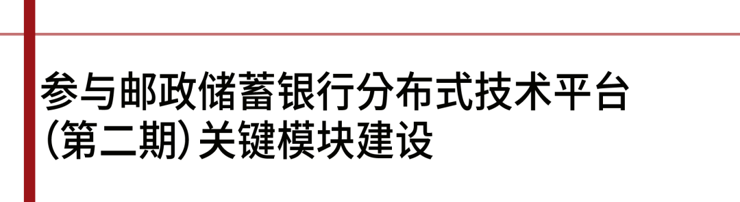 今年4月,郵儲銀行新一代分布式核心技術(shù)平臺(一期)成功投產(chǎn)上線,神州信息作為新核心建設(shè)重要參與者,在技術(shù)平臺一期建設(shè)中承擔(dān)產(chǎn)品裝配和差異化定價兩個關(guān)鍵功能的咨詢、設(shè)計(jì)和需求編制等工作。一期項(xiàng)目上線,為郵儲銀行后續(xù)新核心建設(shè)夯實(shí)了基礎(chǔ)。