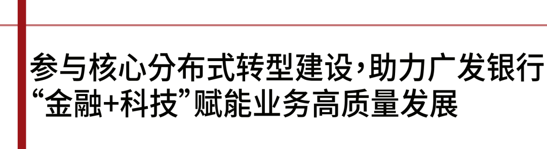 廣發(fā)銀行啟動核心系統(tǒng)分布式轉(zhuǎn)型,分步推動主機(jī)下移,加速數(shù)字化轉(zhuǎn)型步伐,為構(gòu)建開放金融服務(wù)生態(tài)奠定基礎(chǔ)。廣發(fā)銀行作為全國性股份制商業(yè)銀行中的科技排頭兵,一直走在金融科技探索與實(shí)踐的前列,以“金融+科技”賦能網(wǎng)點(diǎn)、運(yùn)營、業(yè)務(wù)、產(chǎn)品等各方面的數(shù)字化創(chuàng)新轉(zhuǎn)型。在統(tǒng)籌發(fā)展與安全的大背景下,廣發(fā)銀行圍繞“自有技術(shù)、自有平臺、自有隊(duì)伍”的轉(zhuǎn)型目標(biāo),不斷加大對自主技術(shù)平臺體系建設(shè)。