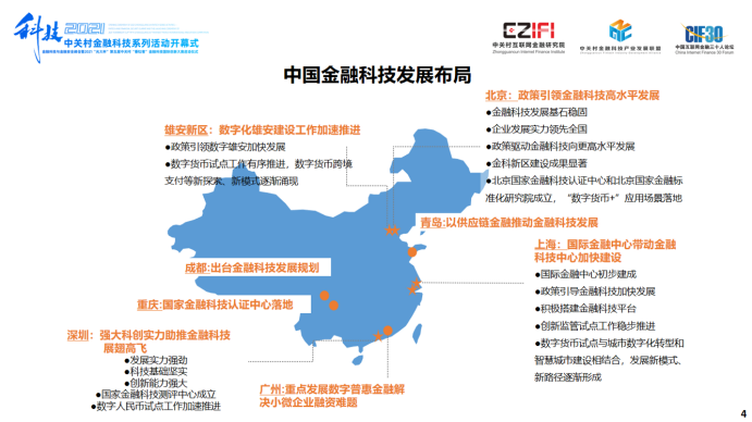 目前,中國金融科技發展水平整體向好,各城市發展各有側重。東部總體實力仍然比較強,西部也在加速發展,金融科技發展速度和水平在差異發展中逐漸縮小。北京地區作為國內金融科技發展的“領頭雁”,以政策驅動向更高水平發展;上海圍繞國際金融中心建設,在提高國內外影響力的同時帶動金融科技更全面的發展;深圳強大的科創實力,在經過改革開放40周年的實力厚積后,向更高水平遞進。