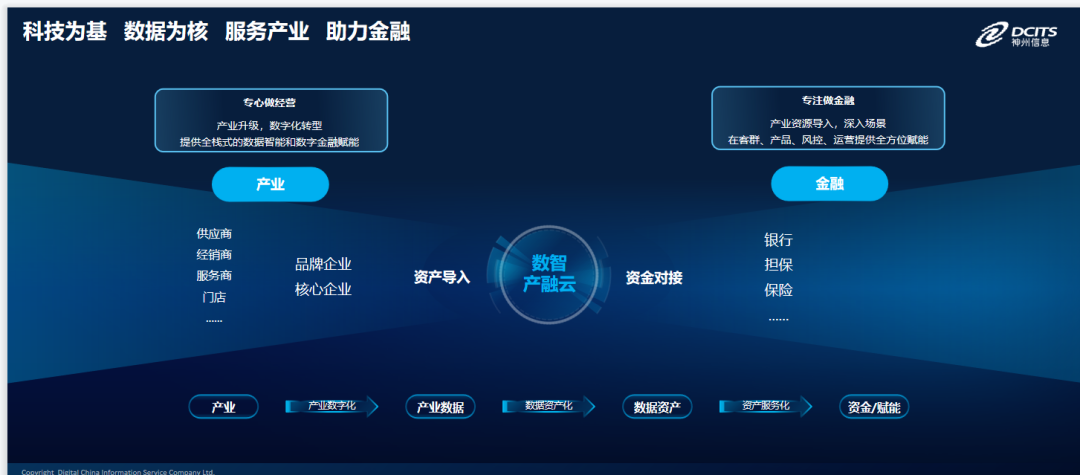一方面,為產(chǎn)業(yè)側(cè)提供全棧式的數(shù)據(jù)智能和數(shù)字金融賦能,助力核心企業(yè)及其上下游大量的中小微企業(yè)進(jìn)行數(shù)字化轉(zhuǎn)型,實現(xiàn)產(chǎn)業(yè)升級,使其專心做經(jīng)營;