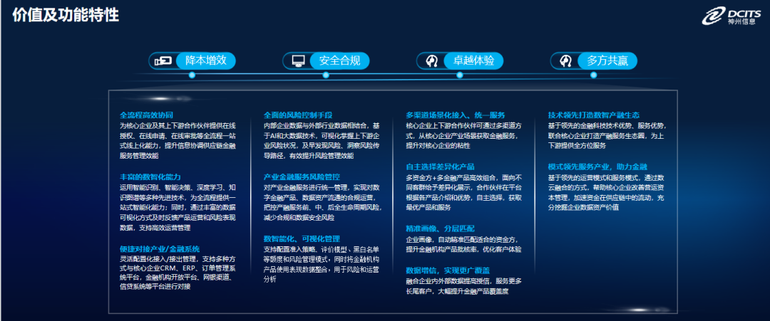 以下是產(chǎn)融DaaS產(chǎn)品的價值及功能特性,總結(jié)起來十六個字“降本增效、安全合規(guī)、卓越體驗、多方共贏”