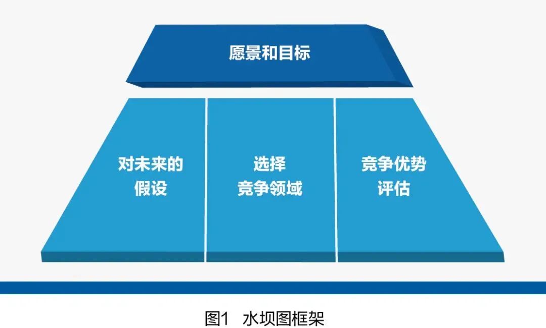 水壩圖由三部分組成,最左邊是對未來的假設,就是如何看待企業戰略;中間是企業如何選擇競爭領域;最右邊是競爭優勢評估,包括企業要完成怎樣的戰略目標,基于假設和能力,企業要彌補哪些短板,明確哪些關鍵舉措等。