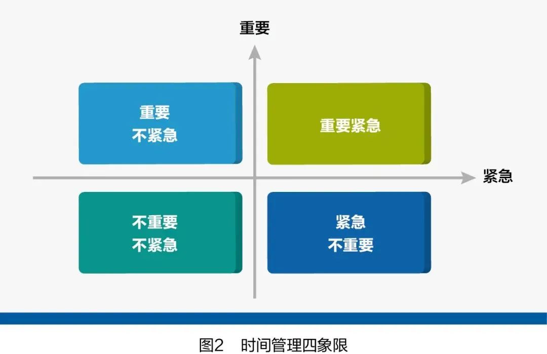 在二八法則的基礎上,還需要應用一個重要的工具——填四象限,即把事情按照重要性和緊急性兩個維度來進行排序,以重要性為縱坐標軸,以緊急性為橫坐標軸,形成四個象限,將精力集中在重要的事情上,少做或者不做不重要的事情,如圖2所示。