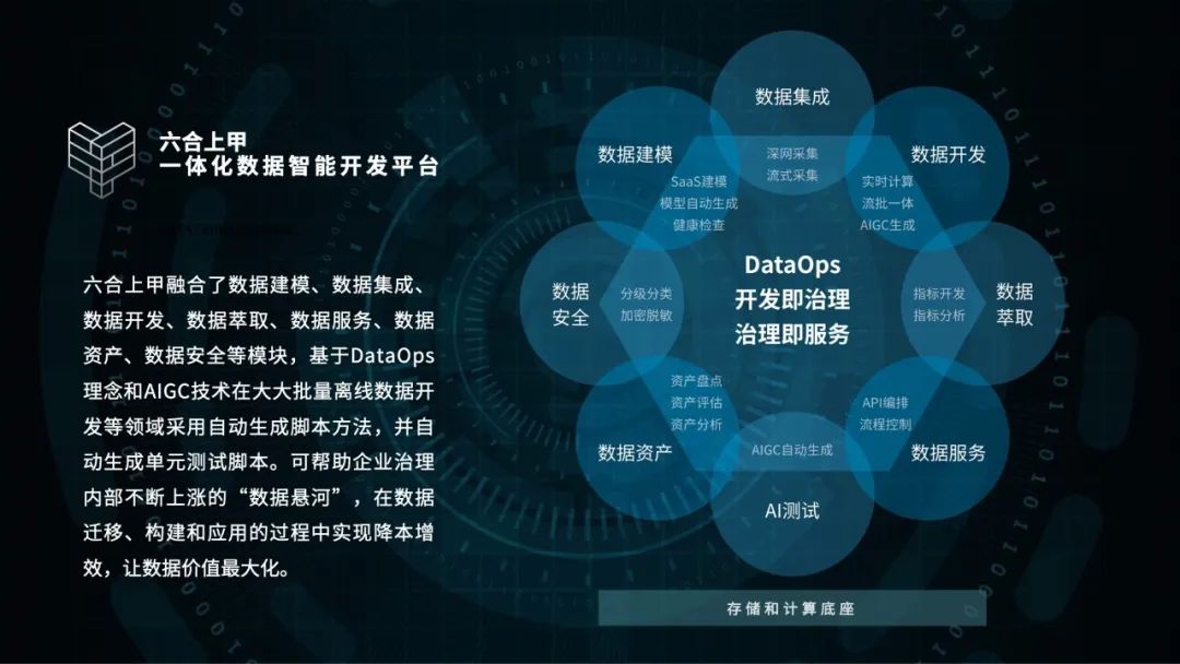 最后,黃萬忠聊到數(shù)據(jù)資產(chǎn)價(jià)值變現(xiàn)的方法,也著重推薦了神州信息在數(shù)據(jù)資產(chǎn)價(jià)值發(fā)揮方面的成功經(jīng)驗(yàn)。神州信息根據(jù)實(shí)戰(zhàn)經(jīng)驗(yàn),開發(fā)了一款名叫“六合上甲”的一體化數(shù)據(jù)資產(chǎn)管理和服務(wù)平臺(tái)。它融合了數(shù)據(jù)建模、數(shù)據(jù)集成、數(shù)據(jù)開發(fā)、數(shù)據(jù)萃取、數(shù)據(jù)服務(wù)、數(shù)據(jù)資產(chǎn)、數(shù)據(jù)安全等模塊,基于DataOps理念和AIGC技術(shù)在大大批量離線數(shù)據(jù)開發(fā)等領(lǐng)域采用自動(dòng)生成腳本方法,并自動(dòng)生成單元測(cè)試腳本。可幫助企業(yè)治理內(nèi)部不斷上漲的“數(shù)據(jù)懸河”,在數(shù)據(jù)遷移、構(gòu)建和應(yīng)用的過程中實(shí)現(xiàn)降本增效,讓數(shù)據(jù)價(jià)值最大化。