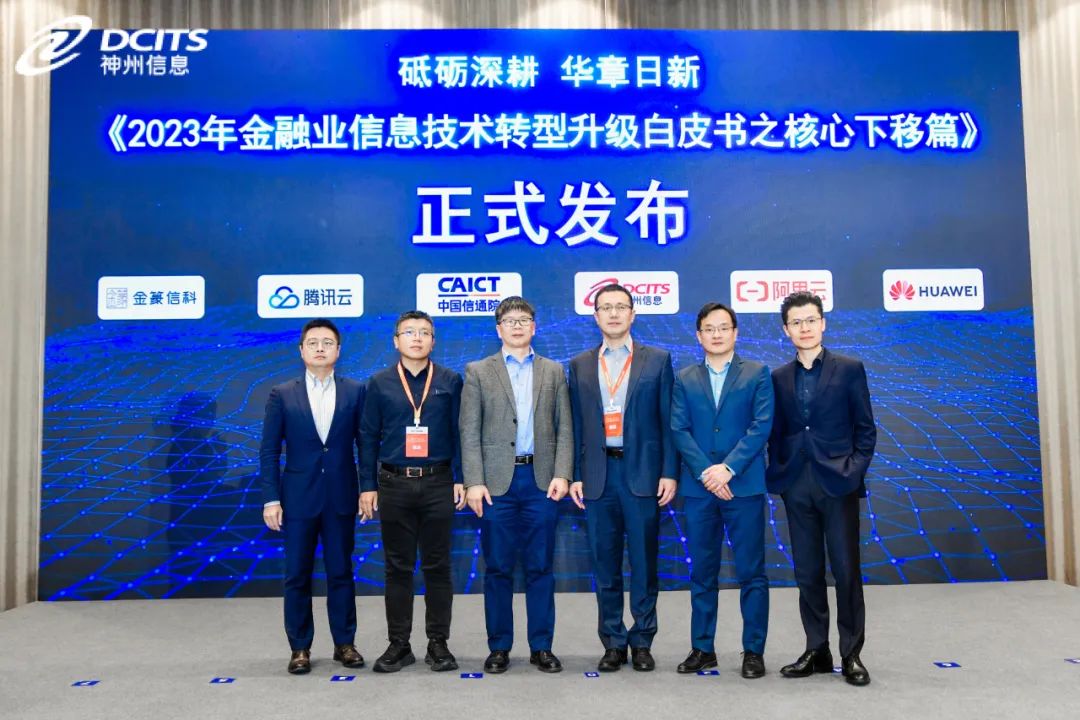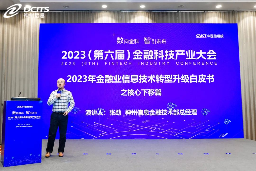 在本次大會上, 神州信息聯合中國信通院、阿里云、騰訊云、華為、金篆信科等單位共同發布了《砥礪深耕,華章日新—2023年金融業信息技術轉型升級白皮書之核心下移篇》(以下簡稱“白皮書”),神州信息副總裁馬洪杰(上圖右三)、中國信通院副總工程師石友康(上圖左三)、阿里云新金融事業部副總經理 宋勇(上圖右二)、騰訊金融云副總經理王豐輝(上圖左二)、華為數字金融軍團分布式新核心業務總經理韓滿(上圖右一)、金篆信科副總經理張校逸(上圖左一)等嘉賓共同出席發布儀式,神州信息金融技術部總經理張勁(下圖)作為代表對白皮書進行了解讀。