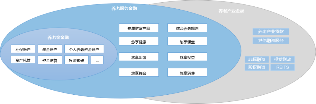 養(yǎng)老金融服務(wù)體系包含養(yǎng)老金金融、養(yǎng)老服務(wù)金融及養(yǎng)老產(chǎn)業(yè)金融。在需求層面,儲(chǔ)蓄和投資是養(yǎng)老金融保障的基礎(chǔ)需求;醫(yī)療、護(hù)理等是養(yǎng)老金融發(fā)展的進(jìn)階需求,高品質(zhì)和差異化體驗(yàn)則是養(yǎng)老服務(wù)金融的高級(jí)需求;在供給層面,“醫(yī)、藥、養(yǎng)、護(hù)”等養(yǎng)老產(chǎn)業(yè)配套建設(shè)也必不可少。