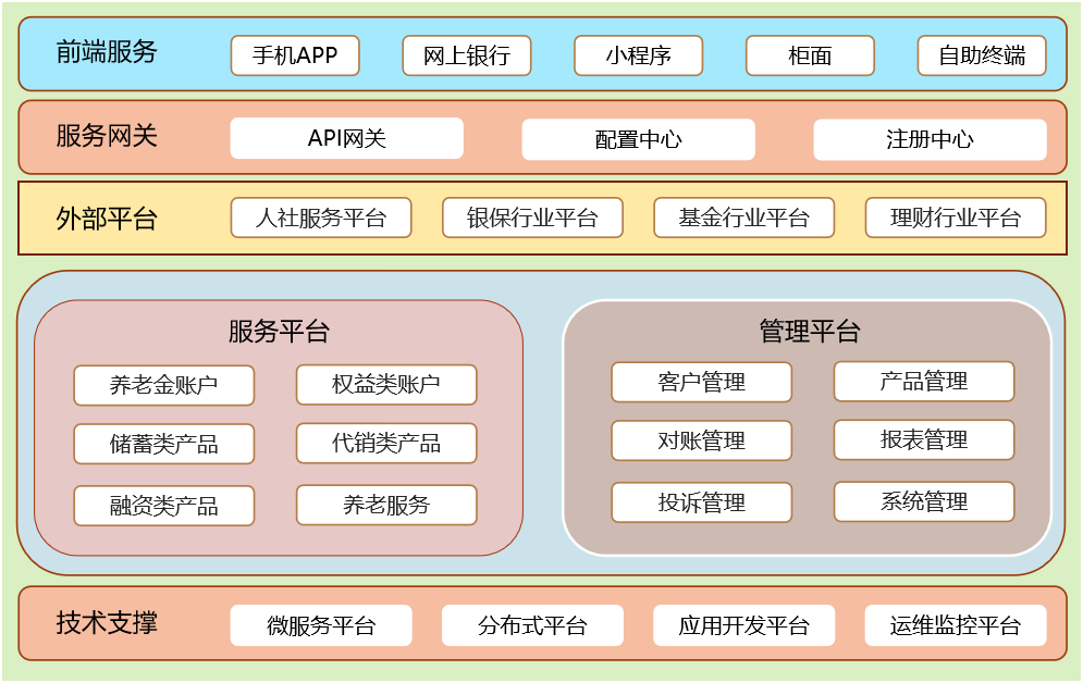 3. 多崗協(xié)作服務(wù):服務(wù)平臺(tái)滿足代客多渠道業(yè)務(wù)辦理、產(chǎn)品投資等多項(xiàng)服務(wù),全面支持人社服務(wù);管理平臺(tái)可協(xié)助行內(nèi)業(yè)務(wù)管理崗、營(yíng)銷崗實(shí)時(shí)了解業(yè)務(wù)進(jìn)程,進(jìn)一步提供差異化服務(wù)。