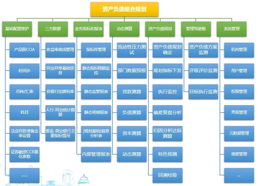 數(shù)字化新資債(資產(chǎn)負(fù)債組合規(guī)劃)系統(tǒng)通過(guò)存量業(yè)務(wù)的歷史數(shù)據(jù)和各部門(mén)預(yù)報(bào)未來(lái)存款吸收、貸規(guī)投放規(guī)模、資產(chǎn)質(zhì)量控制計(jì)劃等,并控制同業(yè)投資支持節(jié)奏,測(cè)算出能同時(shí)滿足資本充足率、杠桿率、流動(dòng)性風(fēng)險(xiǎn)、利率風(fēng)險(xiǎn)、資產(chǎn)質(zhì)量、MPA考核等監(jiān)管指標(biāo)和盈利要求的未來(lái)一段時(shí)期(年度、季度、月度)的資產(chǎn)負(fù)債組合的規(guī)模(量)、結(jié)構(gòu)、價(jià)(利差)規(guī)劃方案(同時(shí)還解決了資產(chǎn)負(fù)債部預(yù)算(關(guān)注規(guī)模、產(chǎn)品結(jié)構(gòu))和計(jì)財(cái)部預(yù)算(關(guān)注利潤(rùn))的有效聯(lián)動(dòng)),將通過(guò)測(cè)算的資產(chǎn)負(fù)債規(guī)劃指標(biāo)下發(fā)給各經(jīng)營(yíng)部門(mén)執(zhí)行,每日監(jiān)測(cè)各規(guī)劃指標(biāo)及完成情況,進(jìn)行偏差復(fù)盤(pán)分析,通過(guò)指標(biāo)歸因分析、基礎(chǔ)產(chǎn)品趨勢(shì)分析、達(dá)標(biāo)測(cè)算等手段,調(diào)整執(zhí)行策略甚至規(guī)劃,實(shí)現(xiàn)資產(chǎn)負(fù)債管理的事前預(yù)測(cè)、事中監(jiān)督及事后分析的全周期智能管理。該流程貫穿決策、執(zhí)行、監(jiān)控等管理關(guān)鍵環(huán)節(jié),形成統(tǒng)一化、標(biāo)準(zhǔn)化、智能化的數(shù)字化管理平臺(tái)。