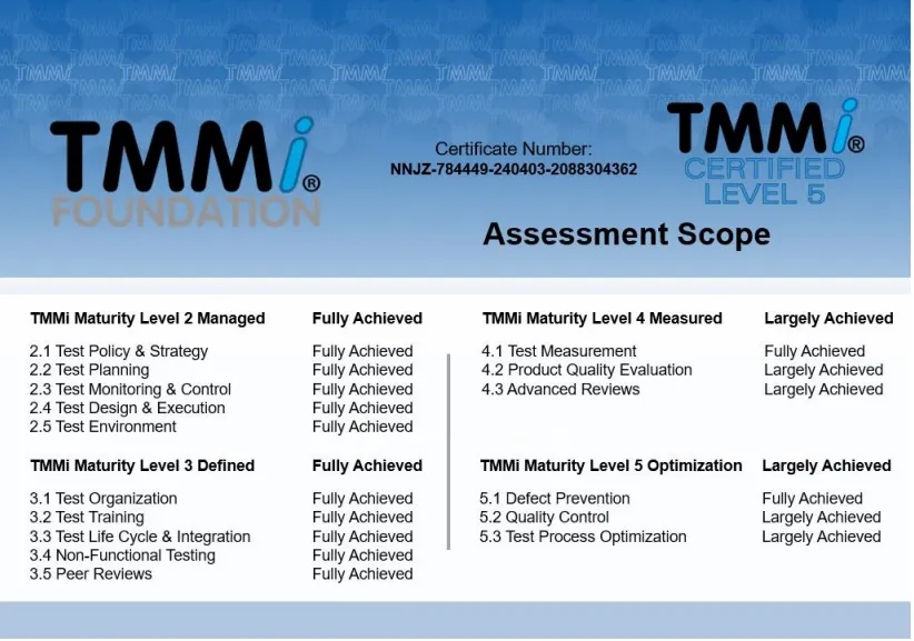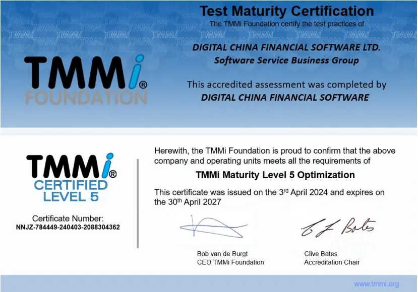 近日,神州信息子公司——今年會融信軟件有限公司(下文簡稱“今年會融信”)通過TMMi(測試能力成熟度模型集成)最高級別5級國際權威認證,成為國內同時獲得TMMi5級認證和CMMI5級認證的企業,覆蓋咨詢、產品需求、軟件開發、測試、運維全流程的IT軟件研發及服務。