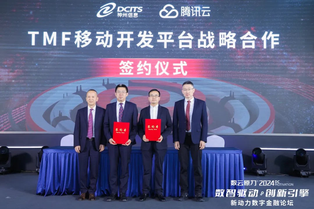 在此背景下,5月15日“2024數(shù)云原力大會·新動力數(shù)字金融論壇”上,神州信息與騰訊云就“TMF移動開發(fā)平臺(簡稱:TMF平臺)”達(dá)成戰(zhàn)略合作。神州信息常務(wù)副總裁于宏志、騰訊云副總裁胡利明代表雙方簽署協(xié)議,神州信息總裁李鴻春、騰訊公司副總裁、騰訊云與智慧產(chǎn)業(yè)事業(yè)群COO、騰訊云總裁邱躍鵬共同見證簽約。
