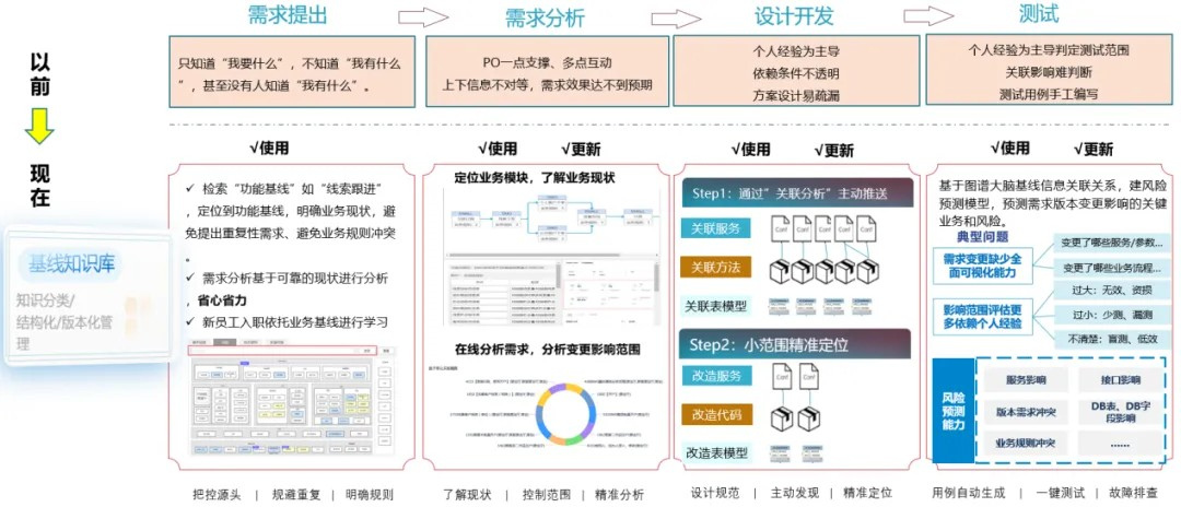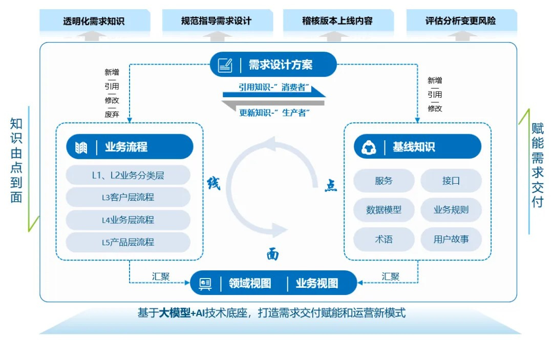 通過(guò)數(shù)智化需求知識(shí)圖譜建設(shè),將需求知識(shí)從點(diǎn)、線逐步匯聚成面:不斷從需求過(guò)程中獲取散落的業(yè)務(wù)流程、服務(wù)和數(shù)據(jù)模型等知識(shí),形成業(yè)務(wù)流程和基線知識(shí),并將基線知識(shí)進(jìn)行串聯(lián),匯聚形成系統(tǒng)視圖和業(yè)務(wù)視圖。持續(xù)推動(dòng)需求知識(shí)整合和數(shù)智化應(yīng)用,將大模型技術(shù)應(yīng)用到需求開(kāi)發(fā)交付環(huán)節(jié),深化“AI+需求交付”注智賦能,打造需求開(kāi)發(fā)交付的“數(shù)字孿生”系統(tǒng);