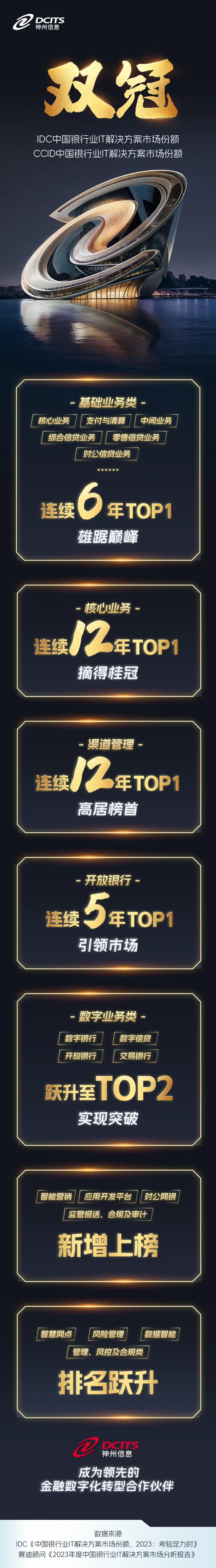 7月16日,IDC發(fā)布《中國銀行業(yè)IT解決方案市場份額,2023:考驗(yàn)定力時(shí)》報(bào)告。報(bào)告顯示,神州信息在基礎(chǔ)業(yè)務(wù)類(含:綜合信貸業(yè)務(wù)系統(tǒng)、支付與清算系統(tǒng)、中間業(yè)務(wù)系統(tǒng)、金融市場業(yè)務(wù)系統(tǒng)、核心業(yè)務(wù))、核心業(yè)務(wù)、開放銀行、渠道管理系統(tǒng)等解決方案領(lǐng)域排名第一;并在數(shù)字業(yè)務(wù)類(含:數(shù)字信貸、數(shù)字銀行、交易銀行、開放銀行)、應(yīng)用開發(fā)平臺、渠道及客戶體驗(yàn)類、智慧網(wǎng)點(diǎn)、數(shù)據(jù)智能等領(lǐng)域排名前列。