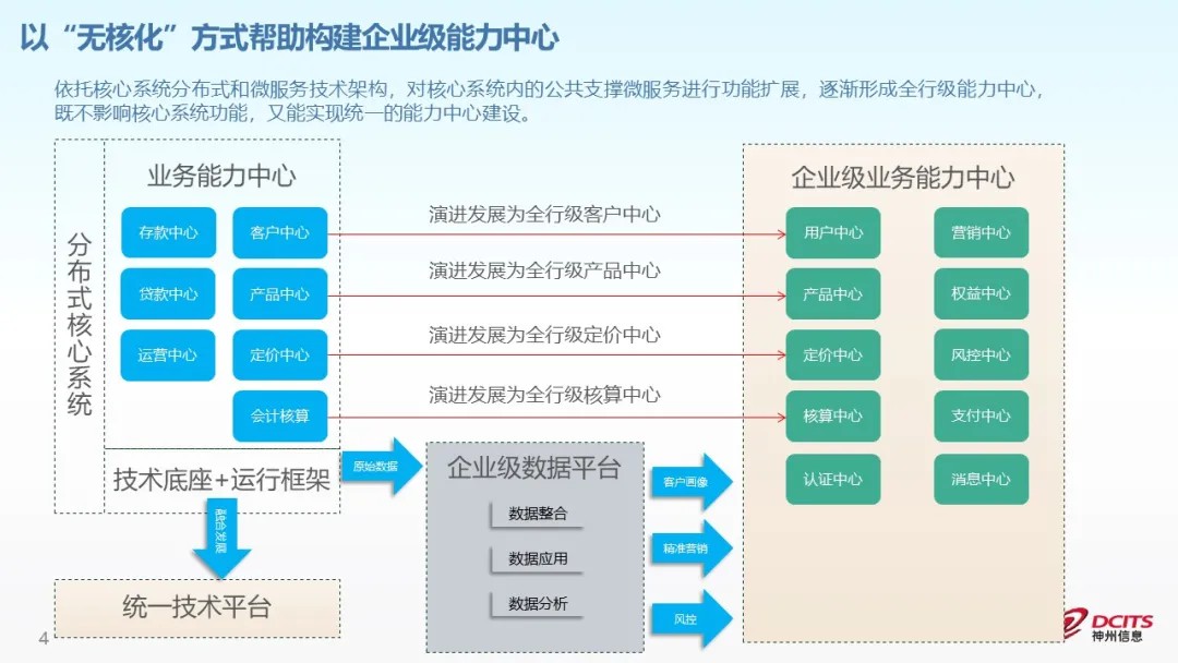 二是實現技術能力的內聚。在“無核化”理念下,進一步實現核心能力的剝離和重塑,終將通用性技術能力內聚為全行級的統一技術平臺,有效支撐上層業務創新和發揮底層云算力的釋放。