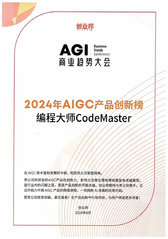 “編程大師 CodeMaster”獲選“2024年AIGC產品創新100強”