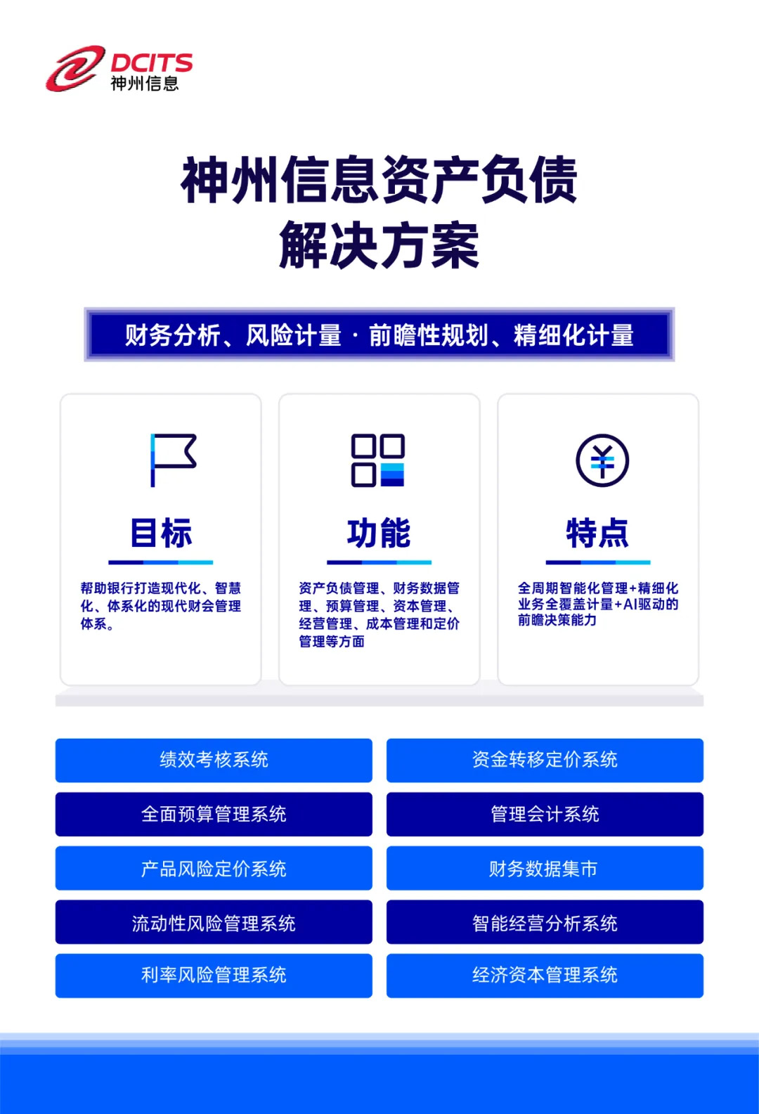 神州信息新一代資產負債解決方案,從資產負債管理、財務數據管理、預算管理、資本管理、經營管理和成本管理等方面,幫助銀行打造現代化、智慧化、體系化的現代財會管理體系。