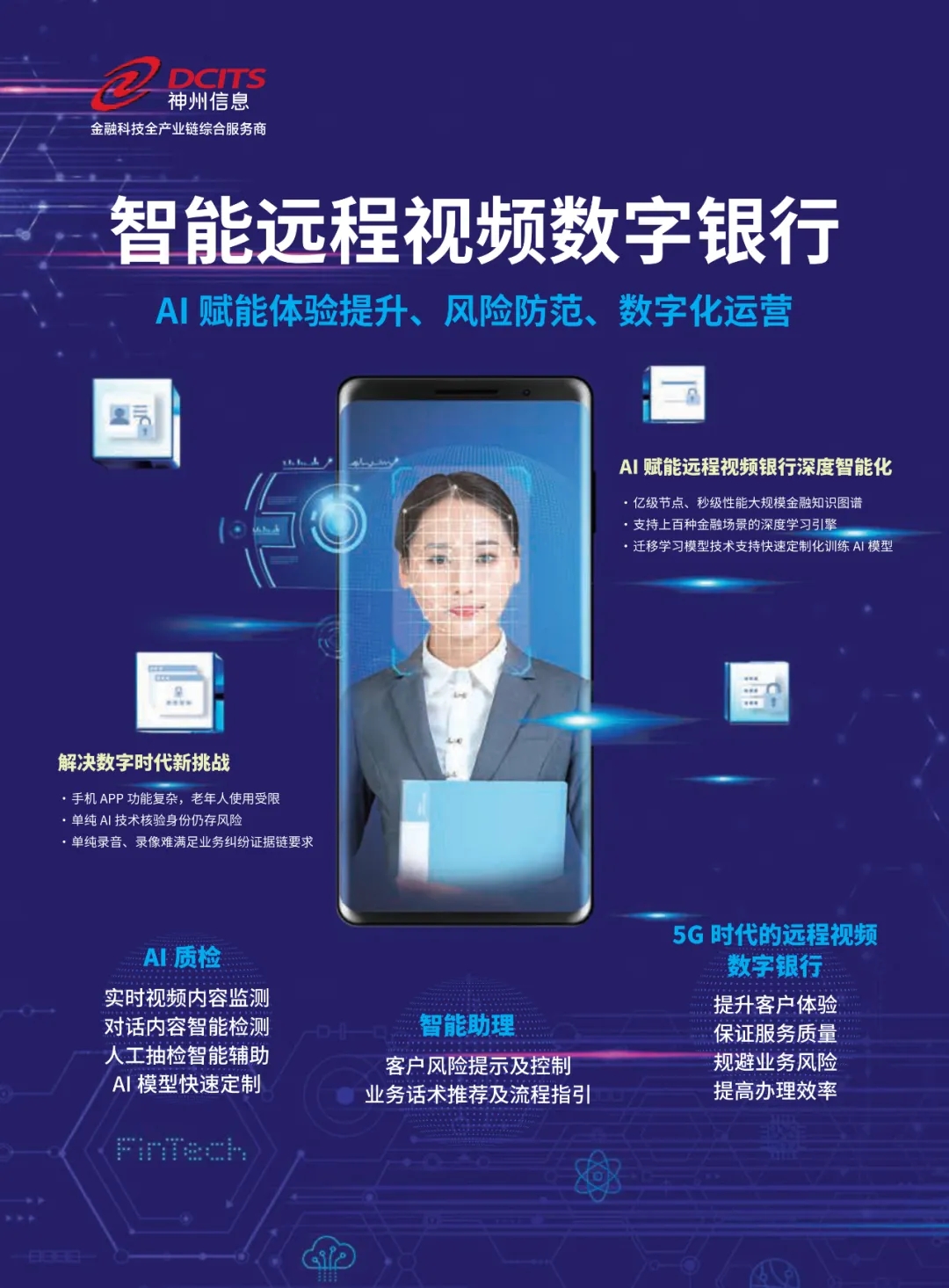 神州信息智能遠程視頻數字銀行,通過億級節點、秒級性能的大規模金融知識圖譜和支持上百種金融場景的深度學習引擎,實現遠程視頻化業務辦理全過程的人臉識別與追蹤、異常環境監測、對話內容檢測等實時AI質檢功能,能夠在有效規避業務風險、提高辦理效率的同時,兼具“臨柜式你說我做”有溫度的用戶體驗和隨時隨地“零接觸服務”的便捷性,為客戶提供更優質的金融服務。