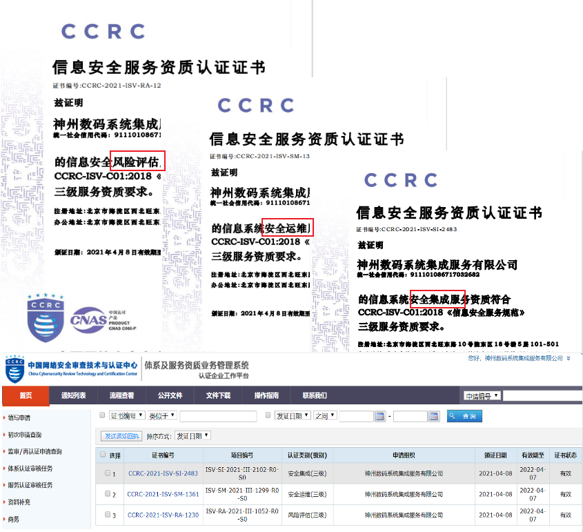 近日,神州信息獲得中國(guó)網(wǎng)絡(luò)安全審查技術(shù)與認(rèn)證中心(CCRC,原中國(guó)信息安全認(rèn)證中心ISCCC)授予的三項(xiàng)信息安全服務(wù)資質(zhì)認(rèn)證證書(shū),包括“信息安全風(fēng)險(xiǎn)評(píng)估服務(wù)資質(zhì)證書(shū)”、“信息安全集成服務(wù)資質(zhì)證書(shū)”與“信息系統(tǒng)安全運(yùn)維服務(wù)資質(zhì)證書(shū)”。這是中國(guó)網(wǎng)絡(luò)安全審查技術(shù)與認(rèn)證中心對(duì)神州信息安全服務(wù)理念和能力的認(rèn)可,標(biāo)志著神州信息在賦能金融安全方面邁上了新的臺(tái)階。