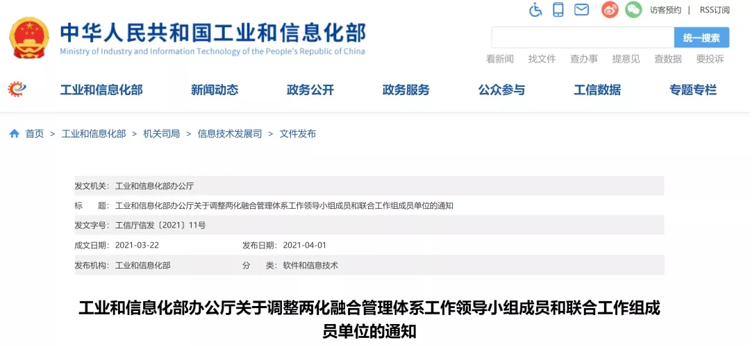 工業(yè)和信息化部辦公廳今天發(fā)布《關(guān)于調(diào)整兩化融合管理體系工作領(lǐng)導(dǎo)小組成員和聯(lián)合工作組成員單位的通知》,根據(jù)工作需要和人員變動情況,對兩化融合管理體系工作領(lǐng)導(dǎo)小組成員和聯(lián)合工作組成員單位進行調(diào)整。通知明確,兩化融合管理體系工作領(lǐng)導(dǎo)小組組長為工業(yè)和信息化部黨組書記、部長肖亞慶。聯(lián)合工作組秘書處設(shè)在國家工業(yè)信息安全發(fā)展研究中心(工業(yè)和信息化部電子第一研究所),神州信息成為工業(yè)和信息化部兩化融合管理體系聯(lián)合工作組成員單位。