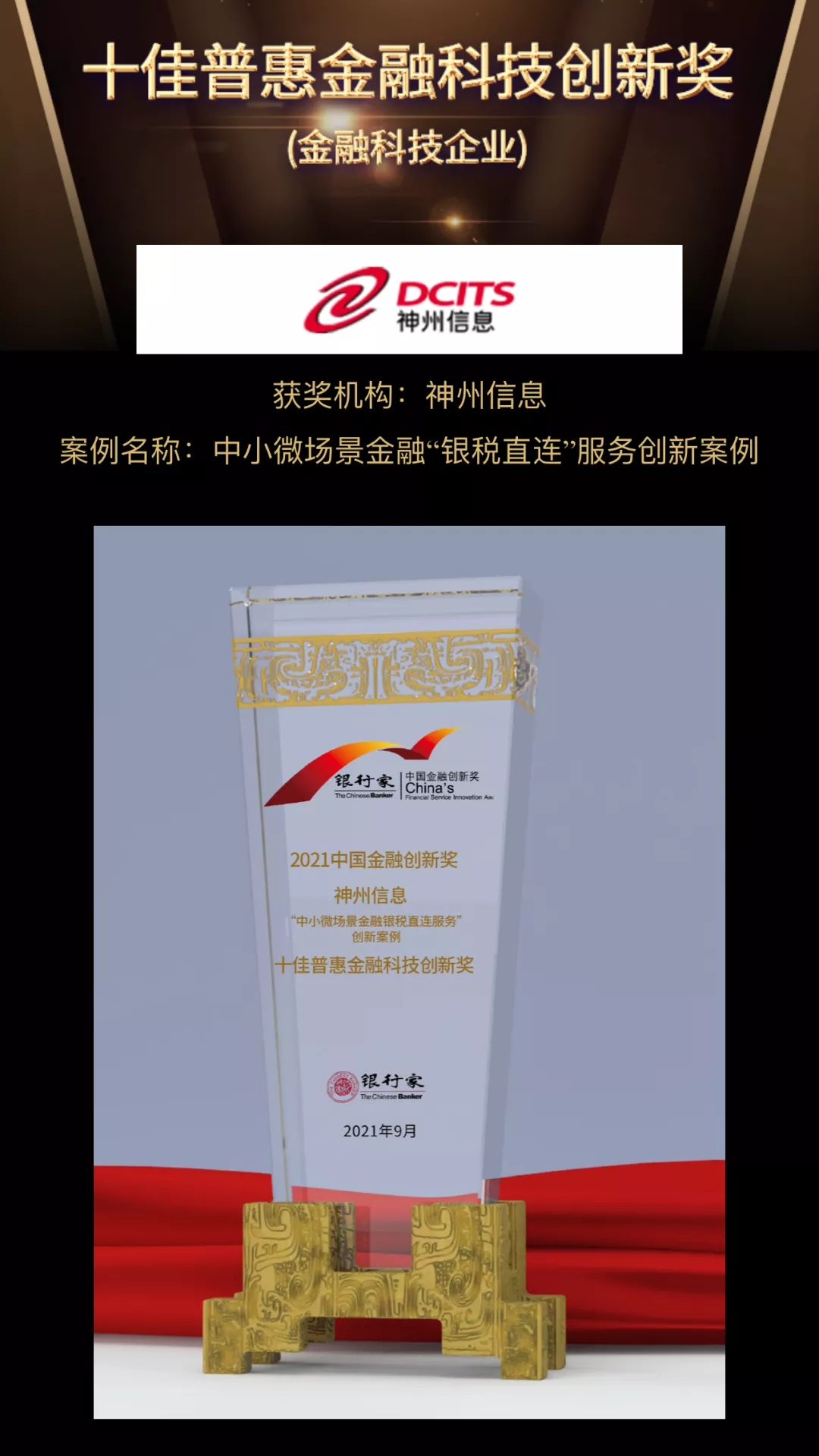 立足建黨百年和“十四五”規劃的開局之年,近日,由《銀行家》雜志主辦的“中國金融創新論壇暨2021中國金融創新成果線上發布會”在京召開,旨在表彰中國金融創新力量。神州信息自主研發的金融超腦Sm@rtFSB和 “銀稅直連”助力金融服務中小微案例分別榮獲2021“最佳金融創新獎”和“十佳普惠金融科技創新獎”兩項大獎;其中“最佳金融創新獎”僅有四家公司獲評。在眾多參選案例中脫穎而出,連續摘得行業重量級獎項,神州信息已成為金融科技創新的風向標。